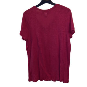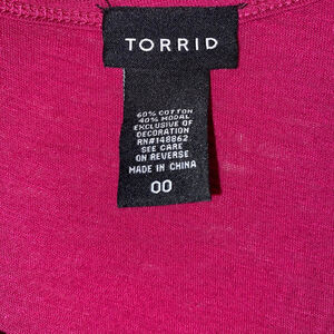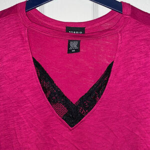 This is a Torrid T-shirt, size 00, equivalent to 14-16. It features a V-neck design with a black lace inset. The shirt is made of 60% cotton and 40% modal for a comfortable and flattering fit. The garment is a vibrant pink color.