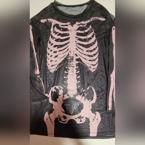 ☠️ Black long sleeve sheer top with pink skeleton print