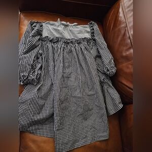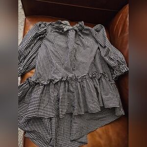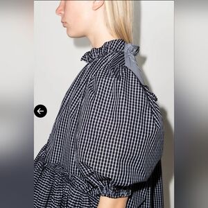 Black and white cotton Helle ruffle neck top from BROGGER featuring ruffled detailing, ruched detailing, high-low hem, short puff sleeves and contrasting panel detail.