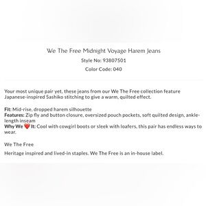NWOT Free People S We the Free Midnight Voyage Harem Jeans in Odyssey Blue $148