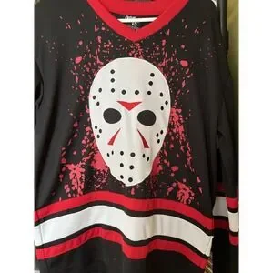 The Friday The 13th Jason Voorhees Hockey Jersey is a stylish and unique addition to any man's wardrobe. Made of black polyester with red accents, this long-sleeve jersey features a V-neckline and a regular fit. The jersey is adorned with a logo patch showcasing the iconic Jason Voorhees character from the horror franchise. Perfect for fans of the series, this jersey is machine washable and suitable for various seasons, adding a touch of horror-themed flair to any outfit. Additionally, the jersey is double-sided for added visual interest.