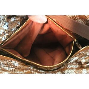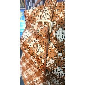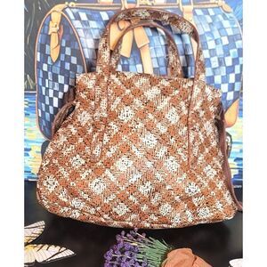 This a gorgeous plaid Marc by Marc Jacobs. It is made of easy to clean and maintain PVC /coated canvas. It has a separate front compartment with a twist lock closure. The main compartment zips and has 2 slip pockets as well as a bigger zippered pocket. Both compartments are lined. It can be either a crossbody or a handbag. I don't believe that the crossbody strap is original to this bag, the hardware is brass instead of gold like the rest of the bag, but it is adjustable and it does match well. Bag is in excellent, unused condition.