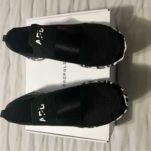 Sleek black sneakers with white accents. Comfortable and stylish. Perfect for everyday wear.