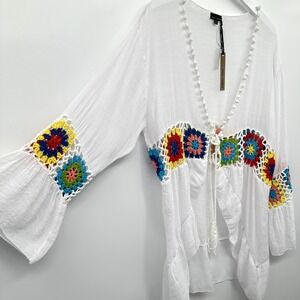 Coco Carmen Cardigan Large XL Crochet Granny Square Hippie Festival Cottagecore