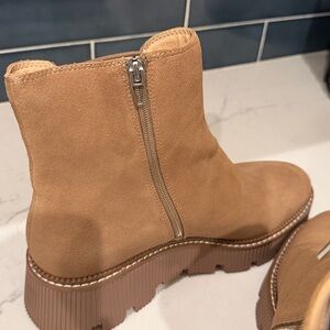Stylish camel booties with side zippers. Chunky sole for added height. Perfect for versatile wear.
