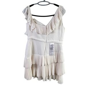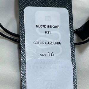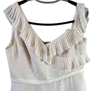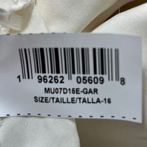 This is a new with tags BCBG Max Azria Jordan Gardenia one shoulder ruffled evening mini dress in a size 16. The exterior is made of Polyester and the lining is polyester and spandex. Note that there is some dirt on the seam under one of the sleeve openings. Barely noticeable. Dry cleaning should take care of it.