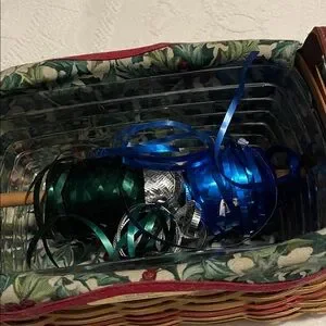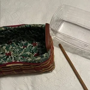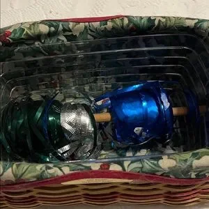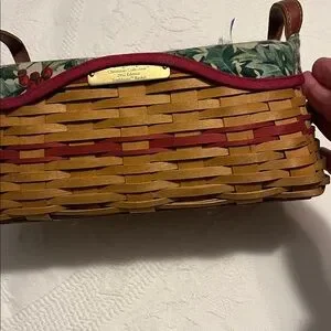 This is a Longaberger Traditions basket from 2002 with protector and spool for ribbon. Use this as you are wrapping gifts! Holly design liner under the protector. Perfect for the holidays. Measures 10 inches long, 6 1/4 inches wide and 4 1/2 inches deep. Perfect for your collection