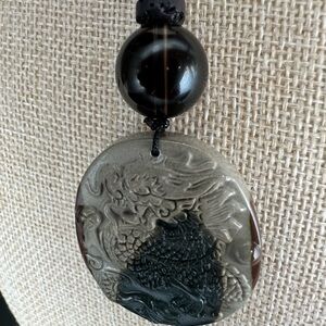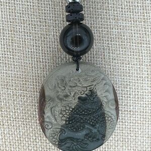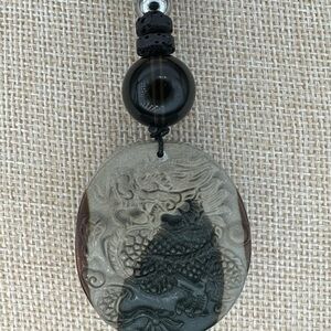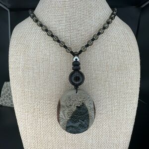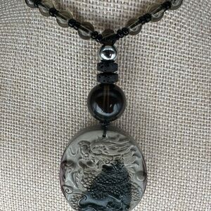Black and Grey Polychrome Jasper Dragon Pendant Necklace on Beaded Cord