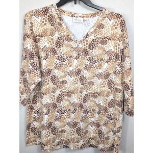D&Co Denim Company Womens V Neck 3/4 Sleeve Top Leopard Print Brown Tan Size L
