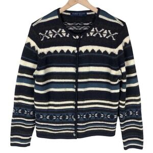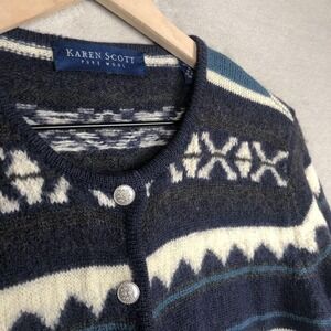 Add a touch of classic 80s vintage style to your wardrobe with this beautiful Karen Scott cardigan. Made from pure wool in Australia, this beautiful sweater features a crew neckline and long sleeves with metal button accents. The Fair Isle pattern and multicolor design make it a perfect addition to any outfit. This cardigan is available in size Medium.