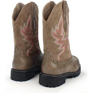 MEASUREMENT: Medium Width; Heel measures approx 1.18",Shaft measures approx 9 " from arch. WESTERN STYLE: 100% vegan.There are embroidered patterns on the suede shaft of the cowboy mid calf boots, which is sophisticated and versatile. Dual pull tabs for easy on and off. ULTRA COMFORTABLE: Soft synthetic leather lining offers a comfortable next-to-skin feel, and provides cushioning to give feet extra comfort.