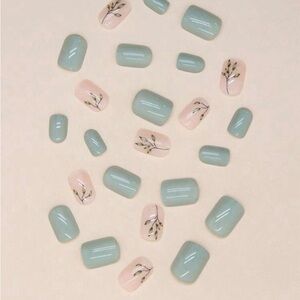Stylish nail art with green and cream colors. Features delicate leaf design. Press on nails with adhesive patches