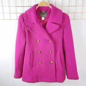 Stylish pink pea coat by J. Crew. Features a double-breasted style with gold buttons. Perfect for a bold fashion statement.