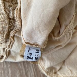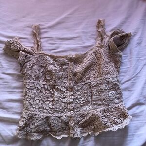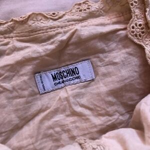 Delicate Moschino piece with intricate lace trim detailing. Features soft fabric with elegant eyelet embroidery along the edges. Designer label shows Moschino Cheap and Chic branding.