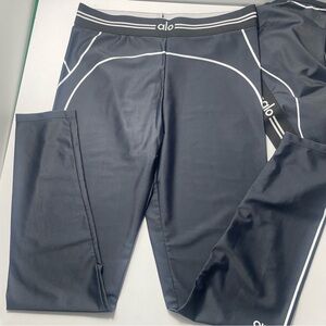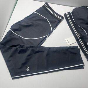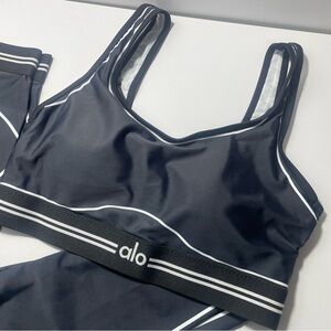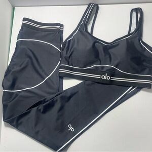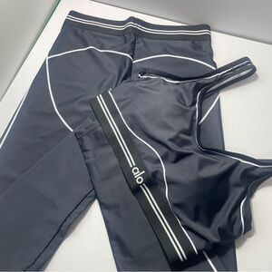 Stylish black sports bra and leggings set. White piping detail. Comfortable and sleek design.