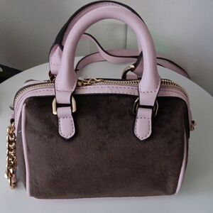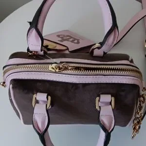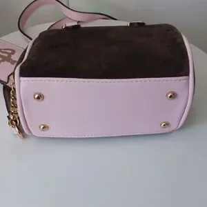 Chic Juicy Couture satchel with pink accents. Features elegant brown body. Includes matching keychain.