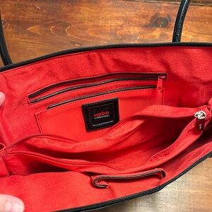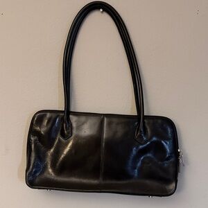 Elegant black leather shoulder bag. Features dual straps and a sleek design. Ideal for any occasion.