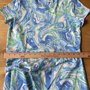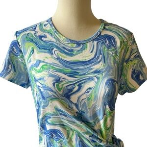 Womens size Medium, signature Catalina Cloth, knee length, pull on, ruched waist with tie, scoop neck, short sleeves, beautiful watercolor pattern of green blue and white.
