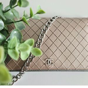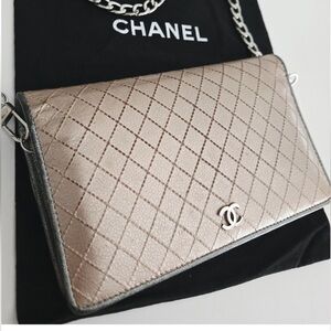 Chanel clutch in elegant beige. Features quilted design and silver chain detail. Timeless accessory for any event.