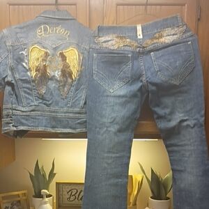 Stylish boot cut jeans by Dereon. Features blue denim with gold embroidery. Perfect for casual wear.