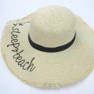 Eat Sleep Beach Embroidered Wide Brim Straw Sun Hat Frayed Beige Collapsible NEW. "Eat Sleep Beach" Women's embroidered wide brim frayed straw sun hat. Brand new. Beige/cream in color with black cursive writing on the brim and a black accent ring. This hat included a chin strap underneath to keep this hat from flying away in windy conditions. Perfect for the beach, pool, or casual wearing anytime you want to keep your head covered and block the sun. This hat is collapsible and foldable for easy travel or storage. One size fits most, the brim measures approximately 4.5 inches with a circumference of approximately 15.5 inches. Please message us with any questions. Thanks!