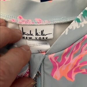 Vibrant kids outfit by Nicole Miller. Features pink and blue patterns. Stylish and fun.