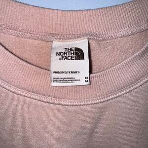 This women's The North Face crewneck pullover in a charming pink hue features a medium retro logo, perfect for a vintage-inspired look. Ideal for casual wear, this medium sweater offers comfort and style. It is in used condition, showing some signs of wear including a few spots and discoloration on the sleeves, as detailed in the images. The classic crewneck design makes it a versatile addition to any wardrobe.