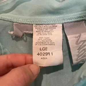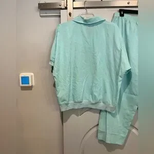 Charming dolman style vneck top with elastic pants. Features delicate floral painting across the collar. Made with comfortable fabric in a soothing mint green shade.