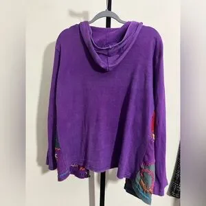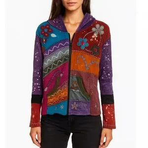 Vibrant patchwork hoodie with floral designs. Features shades of purple, red, and blue.