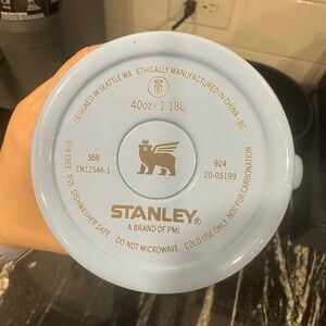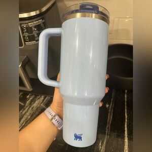 Sky blue Stanley travel mug with a comfortable handle. 40 ounces with flip straw