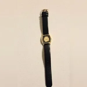 Gently worn, black leather band. Needs new battery. Gold face features lion king.