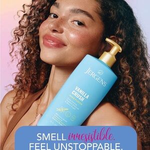 Have your cake and eat it too with this moisturizer. Jergens Shea Fusion Vanilla Crush Body Lotion blends the cozy, cuddly scent of vanilla, toasted almonds and warm sugar in a moisturizing body lotion. It helps your skin feel soft as a cloud. (A smooth, buttercream cloud!) Get touchably smooth hydration that lasts all day–up to 24 hours!