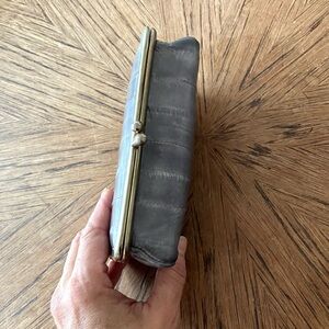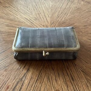Vintage Eel Skin Gray Leather Clutch Purse with Kiss Lock & Mirror / Wallet