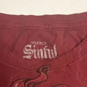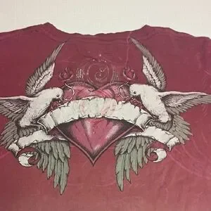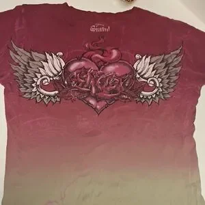 Stylish Ed Hardy tee with heart and wings design. Features red and pink gradient. Short sleeves for casual wear.