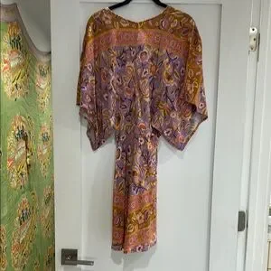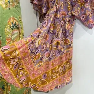 Beautiful floral dress with a V-neck and kimono sleeves. Features a mix of purple, pink, and orange colors.