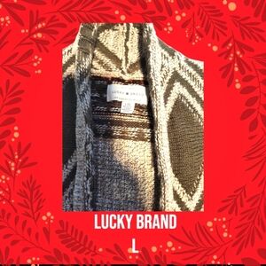 Gorgeous Lucky Brand Large open front cardigan. Taupe with olive geometric border designs. 23" pit to pit; very stretchy. Pre-loved, in excellent condition.