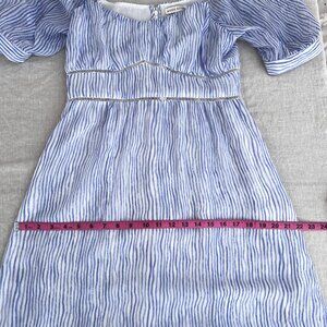 Pre-owned, gently used, excellent condition MOON RIVER Blue and White Stripe Puff Sleeve Midi Dress Size Medium. No marks, stains, holes, or flaws. The exterior, blue-and-white-striped sheer fabric, is bright, and the white slip lining is crisp and clean. Excellent pre-owned condition.