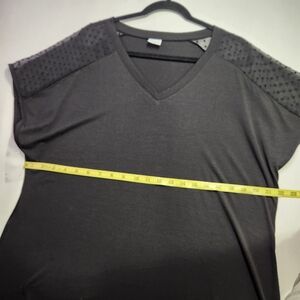 Style: V-neck with sheer sleeves