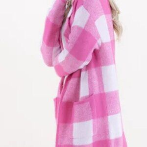 Women's Plaid Knit Coatigan Sweater Jacket Fuchsia Pink with Front Pockets NWT