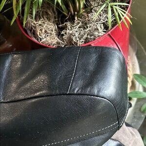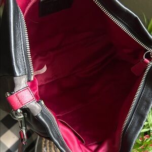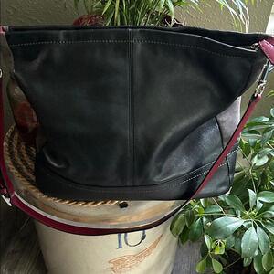 Elegant Coach bag with quilted burgundy front. Smooth black leather finish. Ideal for versatile use.