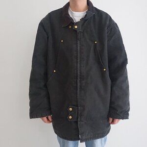 The Vintage Tough Duck Black Canvas Detroit Style Corduroy Collar Zip Up Jacket is a rugged and classic workwear piece built for durability and style. Made from heavyweight black canvas, this jacket features the iconic Detroit-style design with a corduroy collar for added character and warmth.