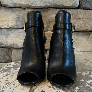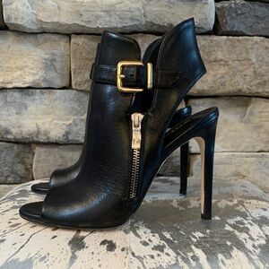 Chic black open-toe booties with buckle and zipper detail. Ideal for a night out. 4.5” heel
