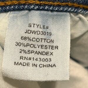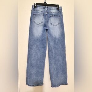 These blue straight-leg jeans showcase a medium wash with natural fading, creating a relaxed and timeless look. The denim transitions from lighter sky blue to deeper indigo, highlighting a traditional texture and weave. Perfect for everyday wear, these jeans offer a comfortable fit and enduring style.