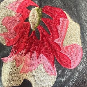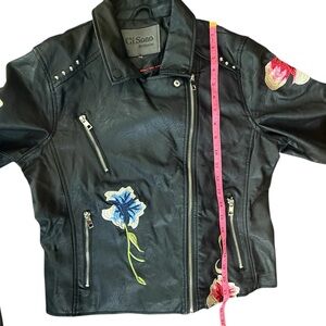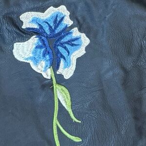 Like new, black vegan leather motorcycle jacket with embroidered blue and pink flowers, zippered pockets and cuffs, silver studs.