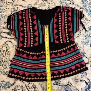 Bold geometric blouse by Savanna Jane. Features striking patterns in black, pink, and teal. Ideal for a standout look.