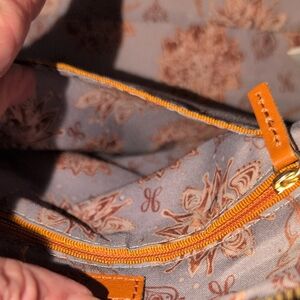 Chic HOBO grey leather with brown leather shoulder strap. Features a stylish design with an adjustable strap. Perfect for everyday use.