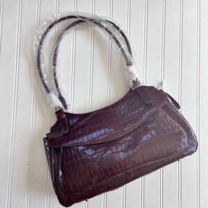 NWT Rich wine crocodile embossed shoulder bag features zippered main pocket, paisley lining, 4 interior pockets in main compartment, zippered outer pocket, and magnetic snap outer pocket. Silver buckle hardware. Approx measurements, 14” long, 8” height, 3 1/2” wide. Strap drop 10 1/2”.