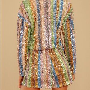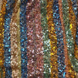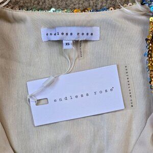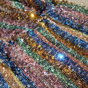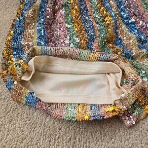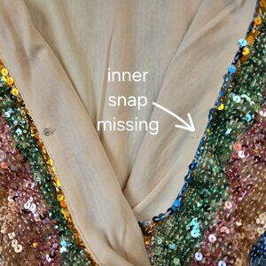 Amazing for parties, concerts, a night out, or New Year's! Originally priced at $150. Fully lined with an elasticized waist. Please note that one of the inner snaps at the chest is missing (see picture). It would be easy enough to use a tiny safety pin or body tape in that spot (or if you sew, it would just take a minute to replace the snap).