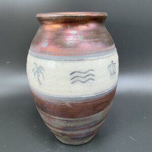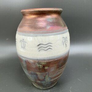 SuperValu 2006 Hand Made Raku Pottery Vase Vessel Iridescent Glaze Signed VTG