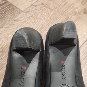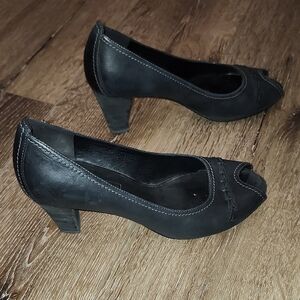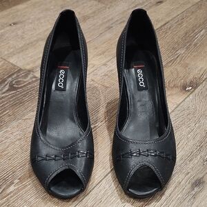 Ecco Keen Black Leather Business Casual Peep Toe Comfort Heels SlipOn Minimalist